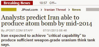 Yadlin also cites a recent ISIS study, which "estimates that at the current pace of installation, Iran could reduce its breakout time to just one month by the end of this year. The report also estimates that at that pace, by mid-2014 Iran could reduce the breakout time to less than two weeks."